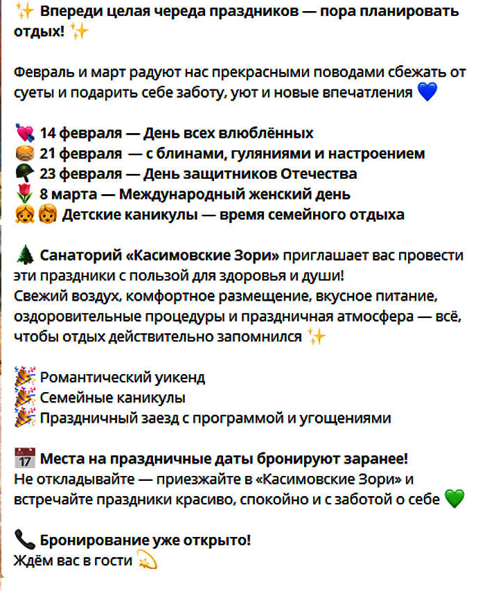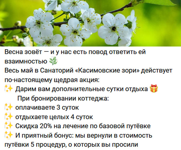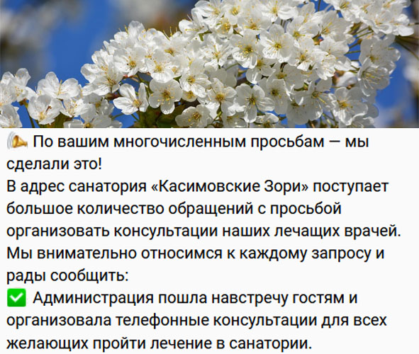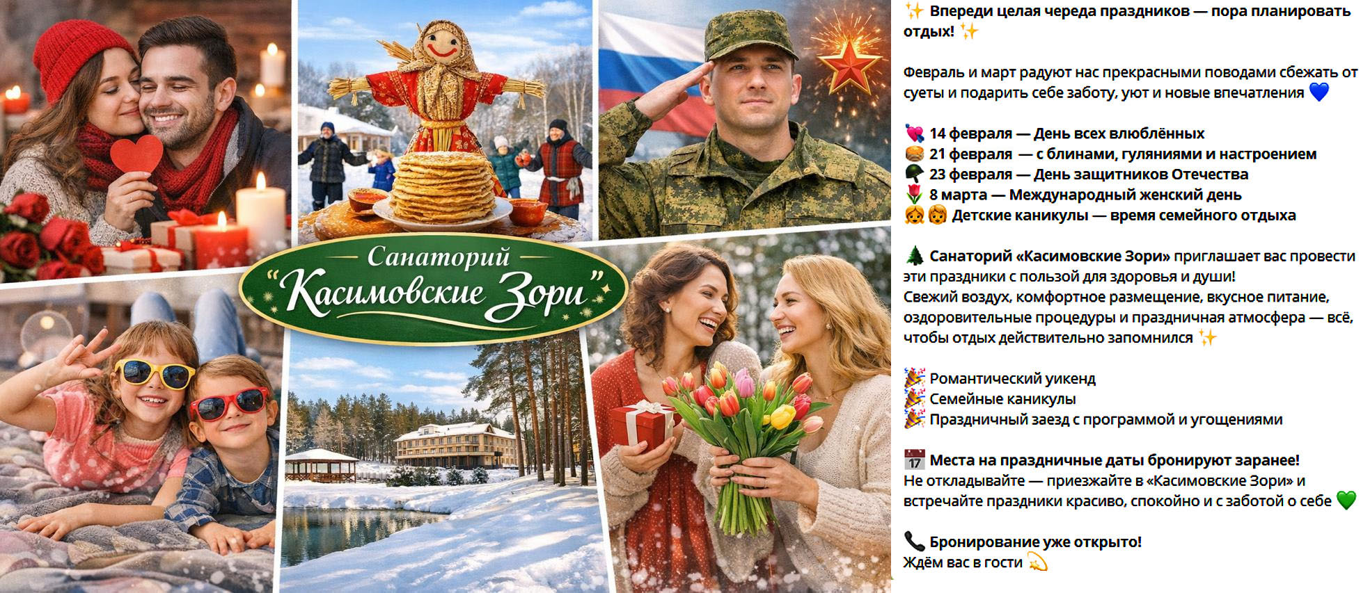 Если хотите попасть в сказку, то у вас есть такая возможность. Это санаторий "Касимовские зори" в Касимове. Медперсонал профессиональный, понимающий. Комнаты очень уютные, как дома. Вид из окна даже в марте необыкновенный! А про еду - отдельные слова благодарности работникам столовой. Вкусно всё без исключения! Всем рекомендую приехать и испытать на себе море позитива.
