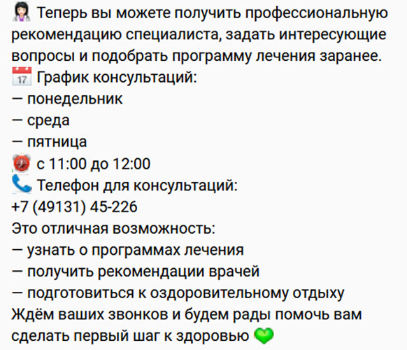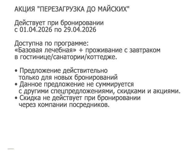 8 лечебных программ, программа выходного дня, экспресс-отдых - всё это доступно для вас на самом современном оборудовании под наблюдении опытного медицинского персонала.