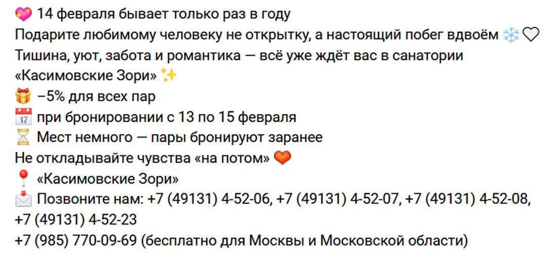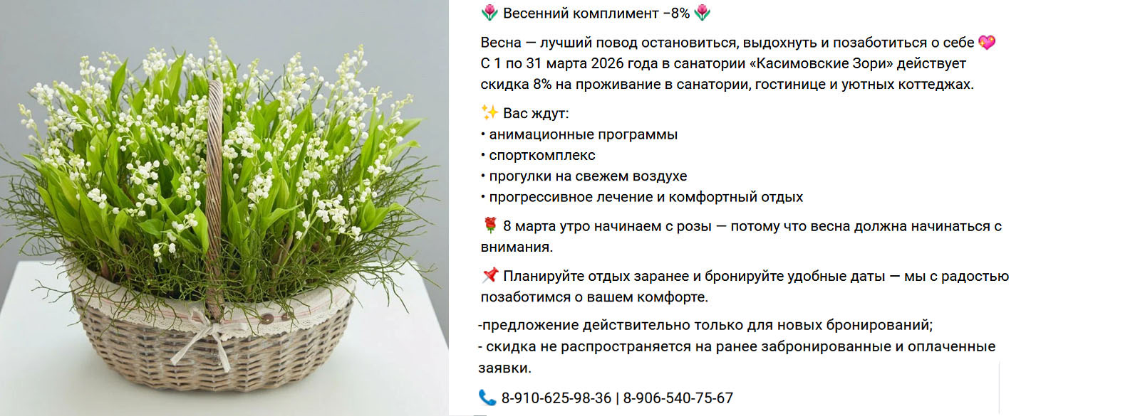 Если хотите попасть в сказку, то у вас есть такая возможность. Это санаторий "Касимовские зори" в Касимове. Медперсонал профессиональный, понимающий. Комнаты очень уютные, как дома. Вид из окна даже в марте необыкновенный! А про еду - отдельные слова благодарности работникам столовой. Вкусно всё без исключения! Всем рекомендую приехать и испытать на себе море позитива.